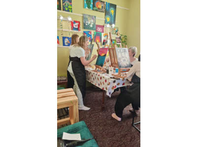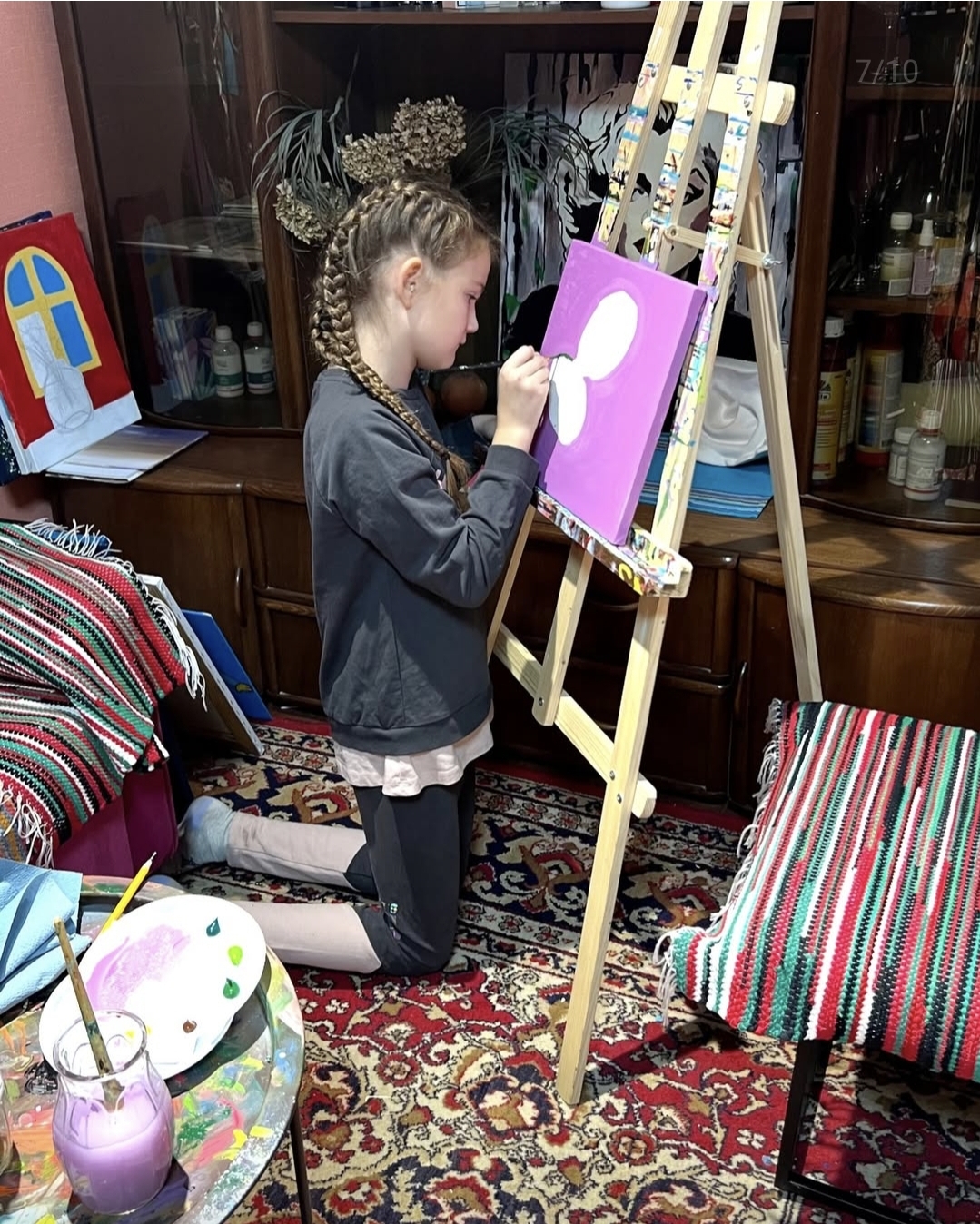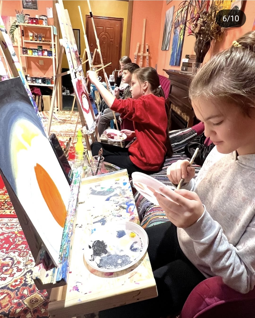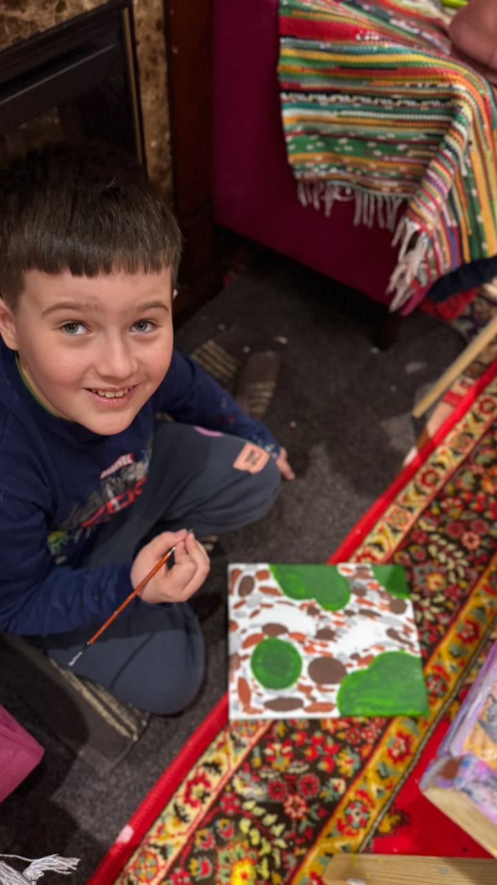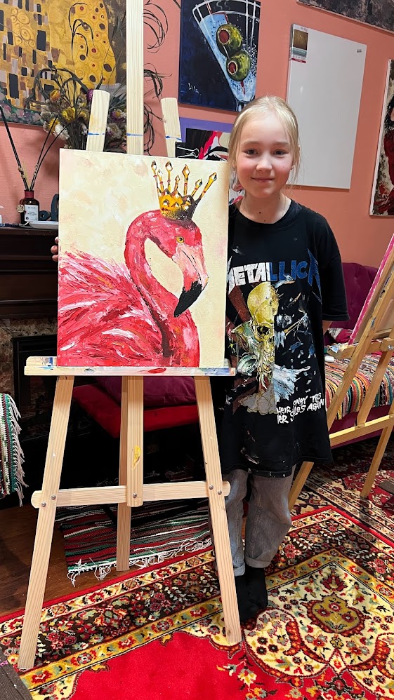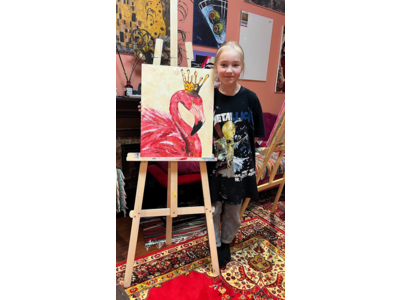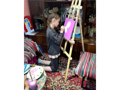 - Намальовану картину юний художник забирає з собою додму (перевага акрилу в тому, що він висихає дуже швидко і не треба чекати тижнями готового результату, як у випадку з масляними фарбами, що діти дуже цінують ))